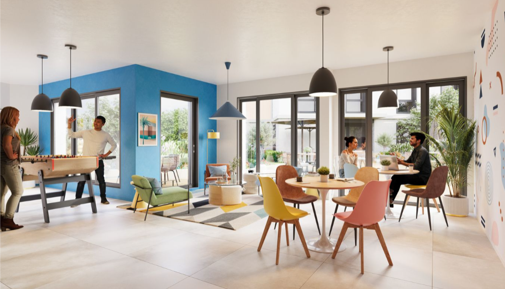 Espaces communs qualitatifs : cafeteria/coworking, laverie, terrasse, locaux vélos, intendant sur place.